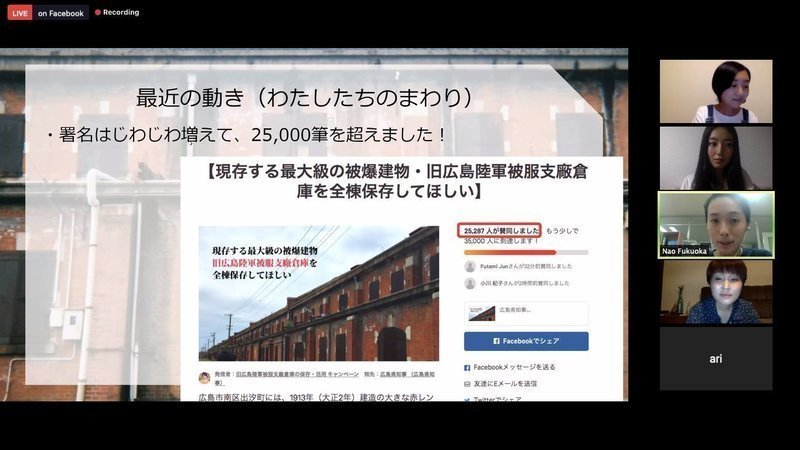 今回ZoomとFacebookの同時配信という形で進めさて頂きましたが、広島だけでなく、東京・神奈川・大阪など日本各地からのご参加頂き、改めて被服支廠に対する関心の高さを実感することができました。今後の広がりをとても楽しみにしています。
