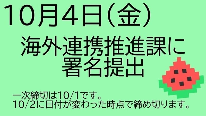 10月4日(金)、海外連携推進課に提出します。