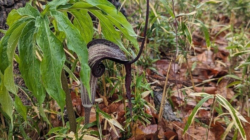ウラシマソウは花が長い釣り竿を垂れるような姿が特徴で、一昔前まで雑木林でよく見かける植物でしたが、最近絶滅危惧種指定となりました。雑木林の減少、放置による竹や笹などの繁殖で昨今日本の草花たちは消えつつあります。