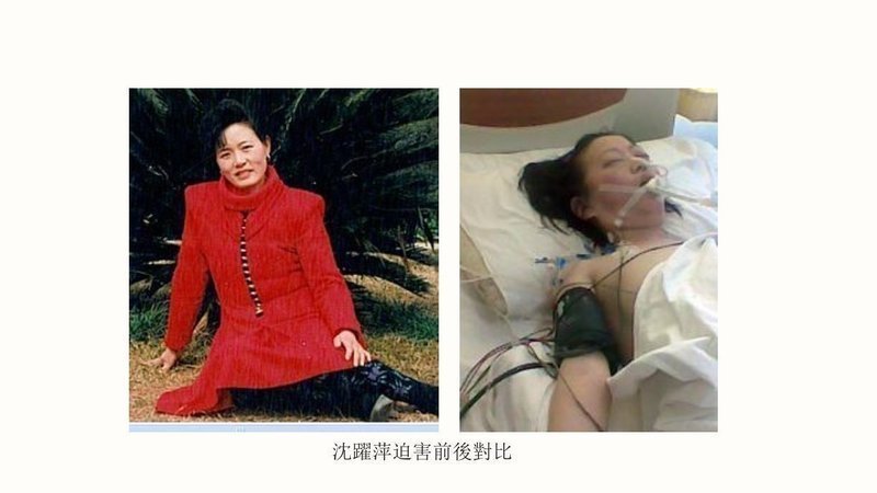 沈躍萍,女,當年四十九歲,玉溪市婦幼保健站主治醫師。二零零四年十二月沈躍萍夫婦被綁架非法判刑五年。關押在女二監集訓監區五年期間,因拒絕所謂的「轉化」,被關了三年「禁閉」。整天面對獄警的輪番轟炸(強迫洗腦)、辱罵及喇叭放到最大音量的洗腦錄音。每天十六個小時被強迫坐在光床板上,沒有站立、行走的自由,不得洗澡、洗衣服,來例假也不允許用衛生巾,還隨時被「包夾」打罵或用針扎、用手擰、掐,每天強逼她吃或者在食物中投放不明藥物,身心遭到巨大的摧殘,受盡了非人的折磨,致使沈躍萍咳嗽不止達八個多月,最後導致昏迷,於二零零九年五月十一日將她送進昆明醫學院第二附屬醫院搶救。家人接到監獄「沈躍萍病危」的通知趕到醫院時,沈躍萍的肺已穿孔,奄奄一息,連睜眼、說話都非常困難了。在病情沒有得到控制的情況下,監獄又強行將沈躍萍轉到條件極差的監獄管理局醫院。在家屬強烈要求下,監獄才辦理了「保外就醫」手續,家人將她送到昆明市第三醫院,終因搶救無效含冤離世。