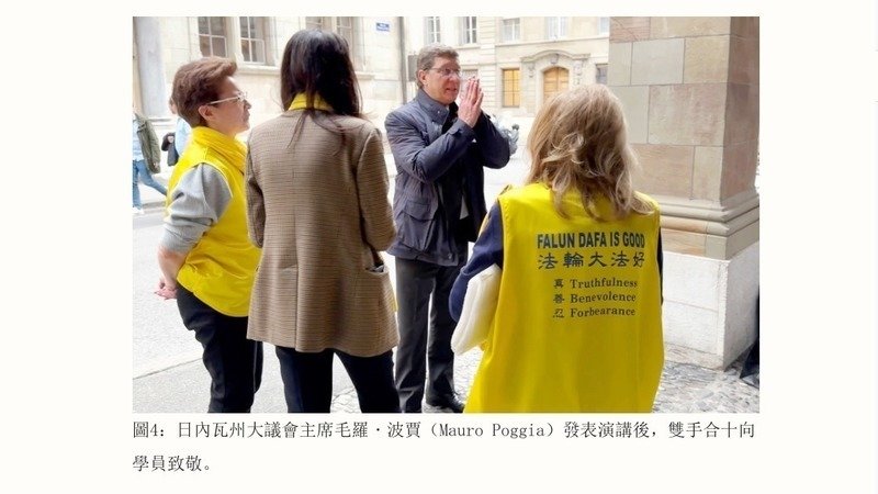 日內瓦州大議會主席毛羅・波賈(Mauro Poggia)來到現場表示支持,他說:「你們的事業是正義的,你們是積極主動的。我們知道在中國發生的事,幸好現在世界睜開了眼睛,但是還不夠。睜開眼睛之後,現在還應該(為你們)發聲,還要使事情發生更多的改變。」