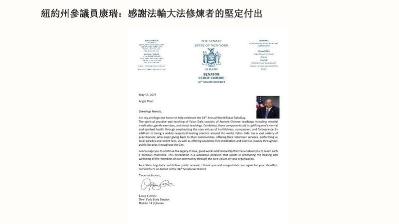 鑑於,秉承悠久的傳統,這個立法機構承認和讚揚那些培養民族和精神自豪感並增強文化多樣性的特徵,強大了這個偉大國家的社區結構;因此,我,紐約州參議員和參議院多數黨領袖安德里亞﹒斯圖爾特-考辛斯有理由自豪地贊同二零二三年五月十三日第二十四屆世界法輪大法日;並且
