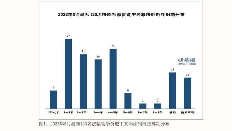 五月份獲知,133名法輪功學員被非法判刑,其中,二零二三年85人,二零二二年8人,二零二一年13人,二零一九年7人,二零一八年6人,二零一七年9人,二零一六年5人。
