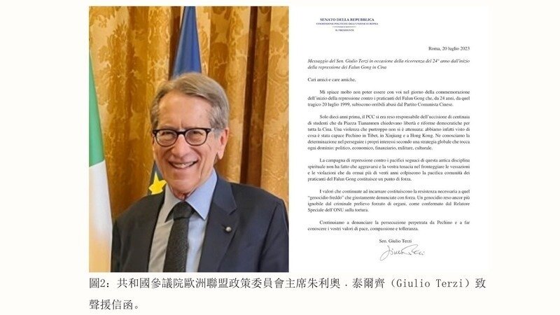共和國參議院歐洲聯盟政策委員會主席朱利奧﹒泰爾齊(Giulio Terzi)在信函中說道:「自一九九九年七月二十日這一悲劇發生以來的二十四年裏,法輪功學員遭受了中國共產黨駭人聽聞的無情迫害。」