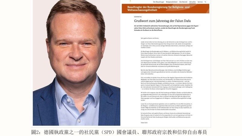 該網站標題顯示,二零二三年七月二十日,在眾多(反迫害)活動引起大家關注法輪大法受迫害之際,德國執政黨之一的社民黨(SPD)國會議員、聯邦政府宗教和信仰自由專員專員弗蘭克﹒施瓦博(Frank Schwabe)向相關者致以問候。