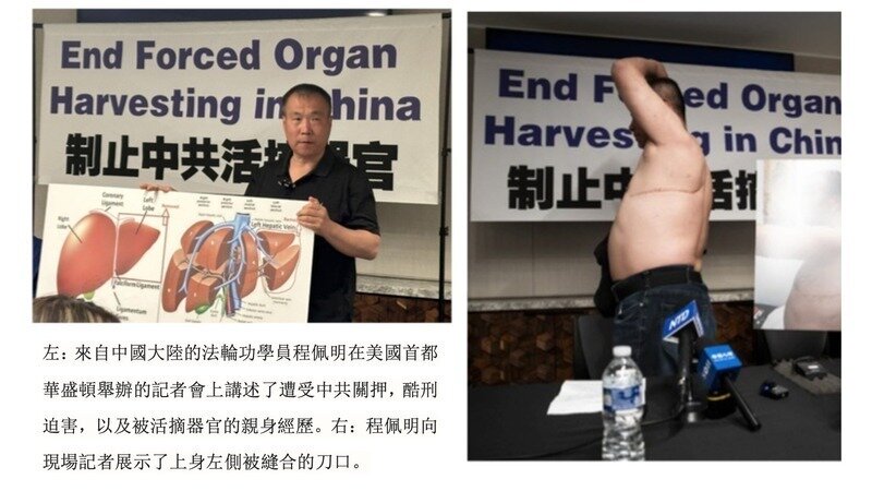 程佩明向現場記者展示了上身左側被縫合的刀口。美國多位政要當天發表聲明表示,「強摘器官的行徑是極其野蠻的,必須停止!」「必須對中共進行責罰。」 「所有善良人都應譴責這一行徑。」