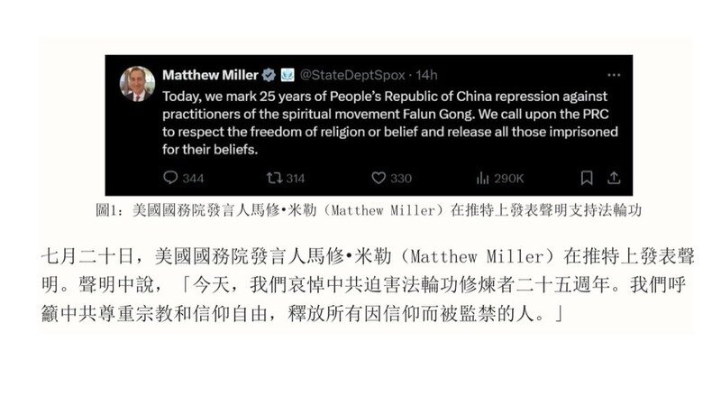 七月二十日,美國國務院發言人馬修•米勒(Matthew Miller)在推特上發表聲明。聲明中說,「今天,我們哀悼中共迫害法輪功修煉者二十五週年。我們呼籲中共尊重宗教和信仰自由,釋放所有因信仰而被監禁的人。」