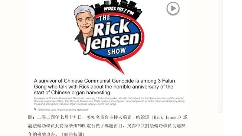 在WDEL.com網站上寫到: 「三名法輪功學員、包括一位中共種族滅絕的倖存者,與瑞克談論了中共開始活摘器官的恐怖周年哀悼日。中共繼續監禁無辜者,通過殺害他們並販賣他們的寶貴器官(如腎臟、肝臟和肺臟)以賺取數十億美元。」