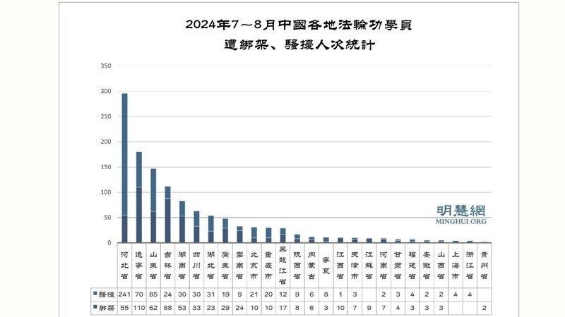 【明慧網】據明慧網報導統計,二零二四年七、八月份獲知,至少又有1219名法輪功學員被綁架、騷擾,其中579人被綁架,640人遭騷擾。60歲以上被綁架騷擾的老年法輪功學員至少有201人次。綁架最多的地區依次為:遼寧省110人,吉林省87人,山東省62人,河北省55人,河南省53人。騷擾最多的地區依次為:河北省241人,山東省85人,遼寧省70人,湖北省31人,湖南省30人。