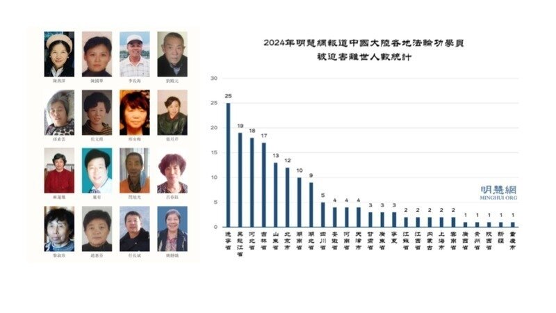 據明慧網曝光統計,獲知二零二四年有二十五個省、自治區、直轄市發生了法輪功學員被迫害致死案件,最嚴重地區依次為:遼寧省25人,黑龍江省19人,河北省18人,吉林省17人,山東省13人,北京市12人,湖南省10人,湖北省9人。被迫害致死的60歲以上老年法輪功學員至少有142人。據中國大陸明白真相的人士講:中共把老年法輪功學員非法判刑,在監獄遭各種酷刑迫害,再剝奪養老金,這就是直接殺人。