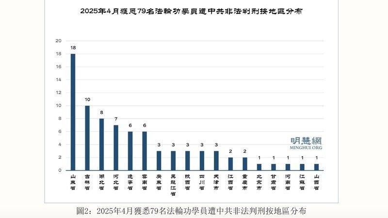 據明慧網報導統計,獲知四月份有79名法輪功學員被非法判刑。其中,山東省18人,吉林省10人,湖北省8人,河北省7人,遼寧省、雲南省各6人。