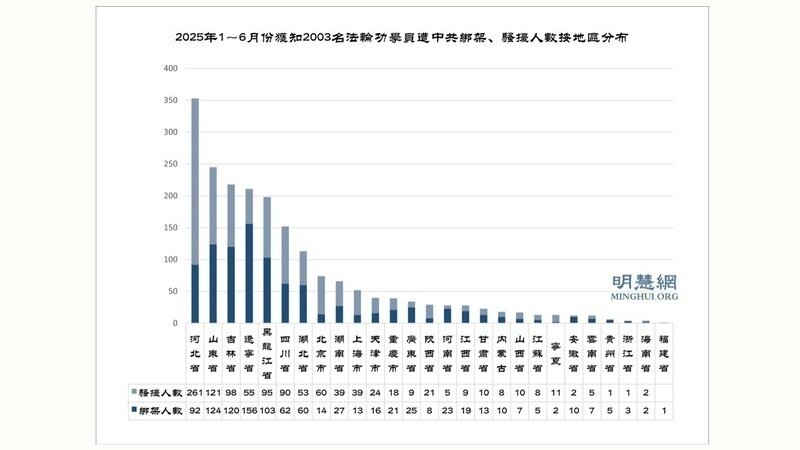 據明慧網報導統計,二零二五年上半年獲知有430名法輪功學員被非法判刑,76人在迫害中離世,2003人被綁架、騷擾。其中,綁架948人,騷擾1055人,抄家446人,洗腦20人,強制採血49人,被迫害離家出走17人。上半年中共敲詐勒索法輪功學員132萬7千90元,至少有20多人被扣發養老金。
