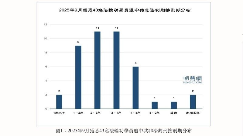 【明慧網】二零二五年九月份,中共以「九﹒三閱兵」、「十﹒一維穩」為藉口,對法輪功學員加緊監控、騷擾、綁架和非法判刑。據明慧網報導統計,九月份獲知,至少又有43名法輪功學員被非法判刑(其中,2025年38人,其它年度5人)。其中刑期最長的8年,最短的3個月,分布於中國大陸的17個省、自治區和直轄市,其嚴重程度按人數依次為四川省11人,吉林省7人,廣東省4人,江西省、山東省各3人。遭非法判刑的法輪功學員的年齡最長者82歲,最年輕者30多歲,其中,80~90歲1人,70~80歲6人,60~70歲15人,50~60歲6人,40~50歲1人,30~40歲2人。