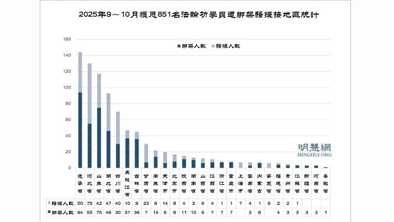 【明慧網】中秋節是月明闔家團圓的傳統節日,然而在中共統治下,許多無辜善良的好人此刻卻身陷囹圄,無法與家人團聚;還有很多人在迫害中含冤離世。今年九月份以來,中共以「九三閱兵」「十一」維穩為藉口,操控公安、街道社區人員等對法輪功學員進行騷擾、跟蹤、監控、綁架、抄家。據明慧網報導統計,九至十月份獲知有至少851名法輪功學員遭綁架騷擾。其中,482人被綁架,369人遭騷擾,243人被抄家,3人被迫流離失所,27人被關洗腦班,24人被通過強制抽血等途徑採取個人信息;中共並搶劫、敲詐勒索法輪功學員退休金至少754100元。綁架、騷擾迫害分布於中國大陸的二十七個省、自治區、直轄市。綁架最嚴重地區依次為,遼寧94人,山東75人,河北55人,湖北46人,黑龍江37人,吉林36人,四川30人。騷擾最嚴重地區依次為,河北75人,遼寧50人,湖北47人,山東42人,四川40人,甘肅23人。