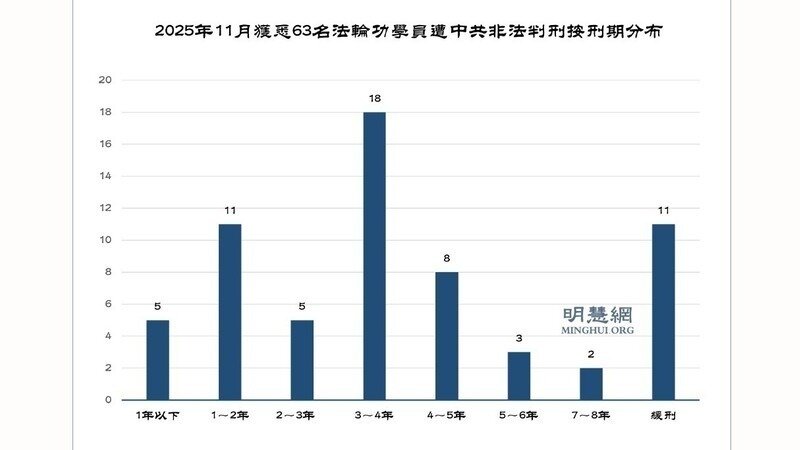 【明慧網】據明慧網報導統計,二零二五年十一月份明慧網獲知,至少又有63名法輪功學員遭中共非法判刑(其中,2025年57 人,其他年份6人)。非法判刑最長者85歲,最年輕者43歲。非法刑期最長的7年,最短的6個月。其中,40~50歲 1人,50~60歲7人,60~70歲15人,70~80歲8人,80~90歲1人。非法判三年以上刑期的31人。十一月份中共法庭勒索法輪功學員罰金約 199500元。這些被非法判刑的法輪功學員中有出入境檢疫局工程師、稅務局一級行政執法員、工程師、教師、內科醫生、司機、職工、農婦等社會各階層人士。大慶女教師段曉榮被枉判七年、勒索六萬元。曾遭十一年冤獄折磨的成都鐘芳瓊又被枉判五年。現年57歲的秦皇島出入境檢疫局工程師付鴻,二零二四年十一月二十日坐火車出行,在火車站被檢票口人員非法攔截、搜查,對方發現付鴻攜帶了法輪大法書籍,在沒有任何法律依據的情況下,將她非法拘禁並報警,撫寧區法院對付鴻非法判刑五年。黑龍江哈爾濱市85歲的法輪功學員曹世斌,因給富裕縣縣長郵寄真相信勸善,被富裕縣公檢法相關人員構陷、非法判刑三年,勒索罰款一萬元。