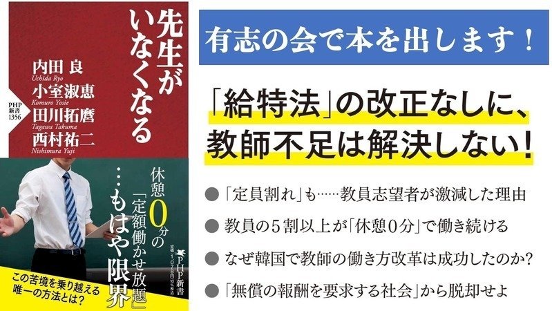 そんな中、有り難いことに、「有志の会」メンバー数人で給特法の問題を訴えるPHP新書を発刊させて頂くことになりました。