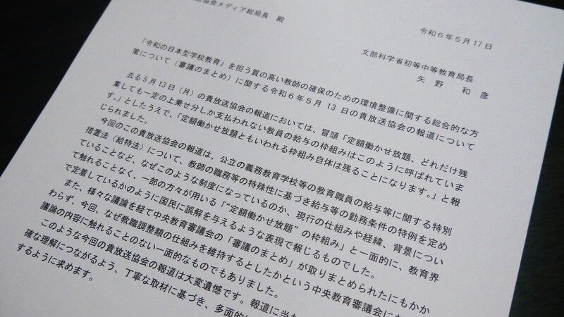 「令和の日本型学校教育」を担う質の高い教師の確保のための環境整備に関する総合的な方策について(審議のまとめ)に関する令和6年5月13日の貴放送協会の報道について