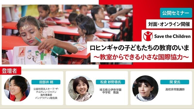 本セミナーでは、当会のバングラデシュ駐在員・田部井梢による最新の現地報告に加え、ロヒンギャ難民キャンプへの訪問経験のある松倉紗野香先生、関愛先生の両氏を交えたディスカッションを通じて、子どもたちの「紛争下の教育」に焦点を当てて考えます。