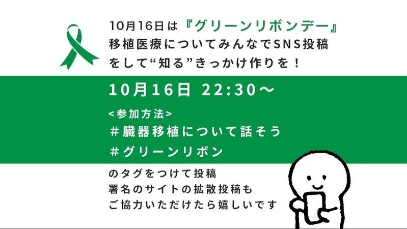 10月16日はグリーンリボンデー(移植医療普及推進の日)です。