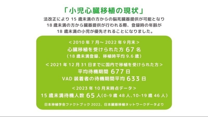 - 待機当時は小児の移植の国内件数がほとんどないため、VAD装着の手術説明時に「移植の件数が少ないく平均が出せないため平均待機期間はありません」と主治医から言われたのは衝撃だった。装着前に国内で待つか募金して渡米するか確認をされたのも驚いた。