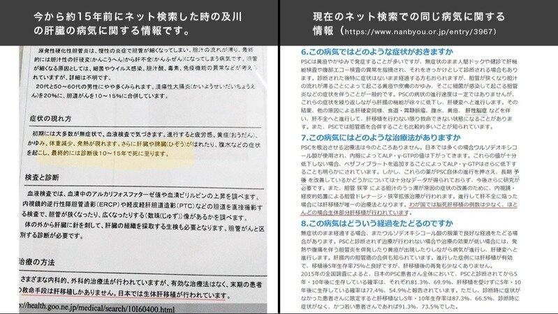可能性を告げられた病名「原発性硬化性胆管炎」の当時のネット情報には『診断から10~15年で死に至る』『有効な治療法はなく末期の患者の救命手段は肝移植しかありません』と書かれていました(お知らせのTOP画像は当時印刷していたものです)。難病発覚当時の私にとって遠い世界のはなしだと思っていた為か、移植の文言を読んだ記憶がなく、移植後に印刷したものを見つけ読み返したことで、移植についての文言があったことに気付きました。