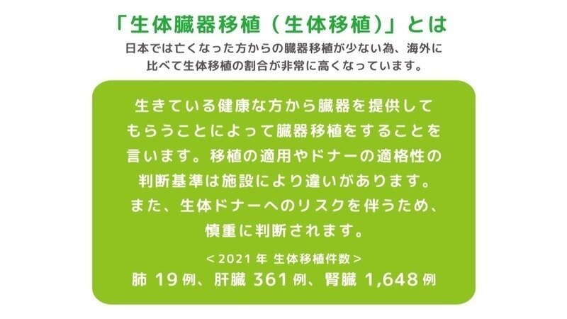 脳死・心停止後の提供による移植は緊急手術となるため医療現場の方たちの負担が大きいのに比べ、生体移植に関しては予定を立てて行える、また、ドナーの検査などを十分に行えるというメリットがあるそうです。