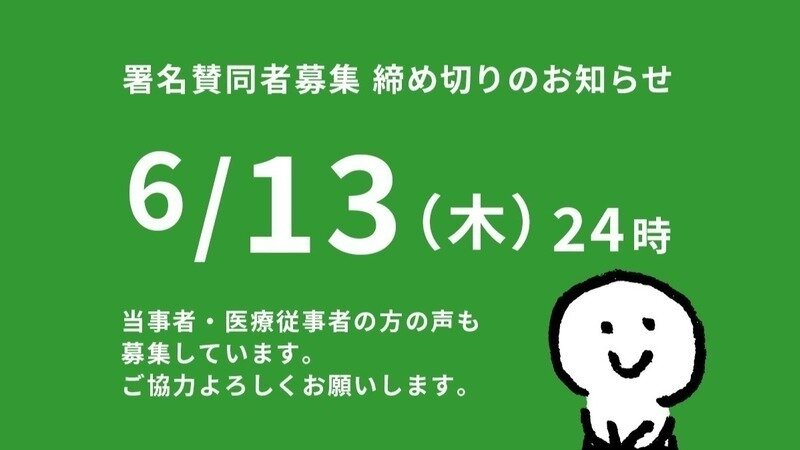 締め切りまで一人でも多くの賛同が集まるよう、署名の拡散などご協力をいただけたら幸いです。よろしくお願い致します。