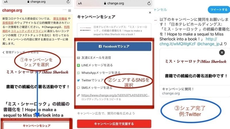 拡散の方法については簡単なものになってしまいますが、説明画像を用意いたしました。皆様の画面と少し違う可能性はありますが、シェアと書かれたボタンを見つけていただければ、難しい操作は一切ありません。もしなければ、サイトのURLを貼って頂けるだけでも大変助かります。改めて、よろしくお願い申し上げます。
