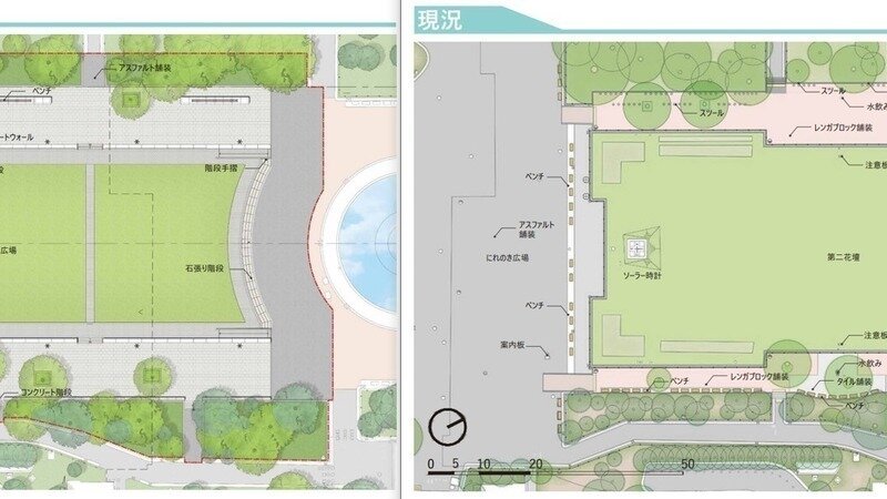 また、芝生広場の周囲の通路を広げるため、図の下部にある大木18本を、わずか数メートル動かすといいます。