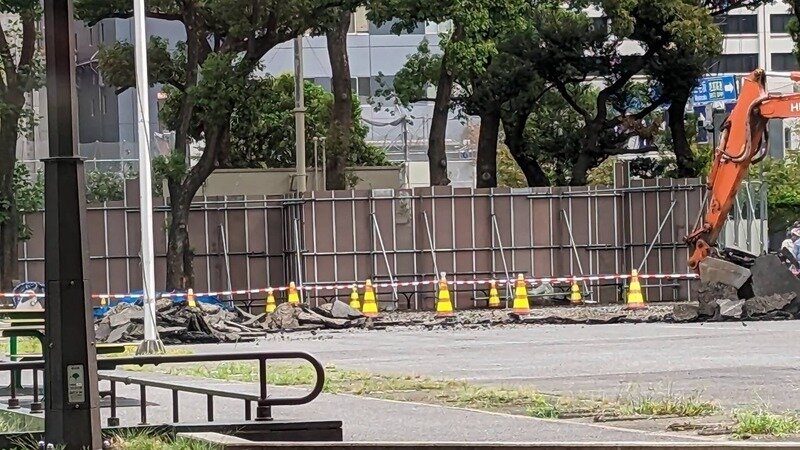 現場に重機が入り、通路だったところのアスファルトをはがし、思い出ベンチを壊しています!