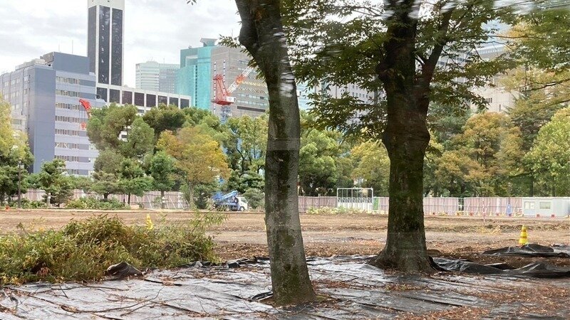 11月11日朝の第二花壇では、もはや花壇の跡形もなく、数台の重機が置かれ、はぎとられた芝生が山積みになり、さらに樹木の枝も山積みになっています。