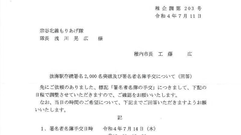 さて、本日、画像のような書状が到着し、てっきり稚内市長に名簿を手交できるものと思っておりましたが、出張中のため市長が不在とのことで、対応した川野副市長に名簿を手交しました。