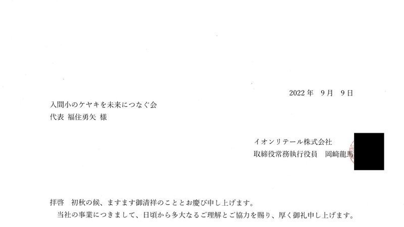 代わりに、9月9日にイオンが当会に送付した文書を公開することで合意しました。文書は会のwebページ(https://keyakinomirai.com/news220805/)をご覧ください。