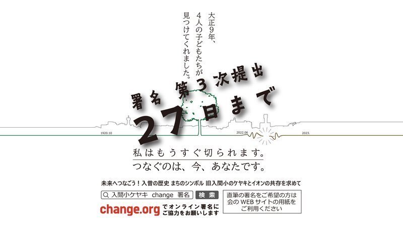 入間小のケヤキを未来につなぐ会は、来週に「旧入間小のケヤキとイオンの共存を求める署名」(オンライン署名+署名用紙)の第3次提出を行う予定です。みなさまの身近にまだ署名されていない方がいらっしゃいましたら、ぜひお声掛けください。入間小関係者や周辺住民でもまだご存じない方がいらっしゃいます。署名運動の周知にご協力いただければ幸いです。明日27日までにご署名頂けましたら、今回の提出分に反映いたします。