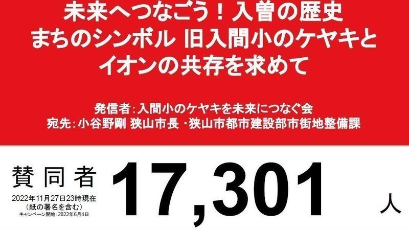 11月後半に入り公開された狭山市議会令和4年第3回定例会の記録において、「旧入間小のケヤキとイオンとの共存を求める署名」を軽視する不適切な答弁や委員長報告が公式に確認されました。入間小のケヤキを未来につなぐ会は11月28日、この件に関して狭山市長と狭山市議会議長宛ての抗議文を提出しました。今回の市執行部の答弁等は、署名の状況について市側の認識不足を露呈しただけではなく、賛同者の想いを深く傷つけ、議員や出店予定事業者に混乱をもたらすもので、到底看過できるものではありません。私たちは今後も、市の発信内容を厳しく点検して参ります。