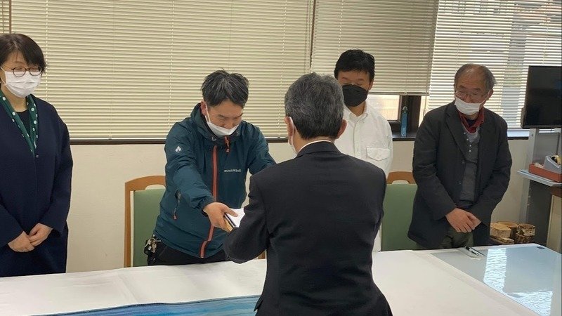船の体育館(旧香川県立体育館)を現在管理している香川県教育委員会です。教育長の工代祐司さんに写真のように直接手渡してきました。