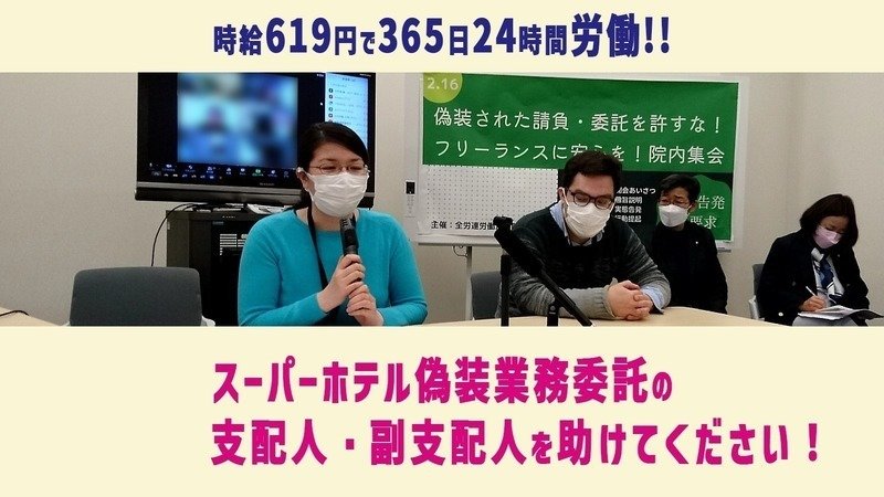 スーパーホテルのように、実態としては労働者のように働き方を拘束されているにもかかわらず業務委託契約を偽装して、労働法上の使用者責任を免れる偽装業務委託契約の手法は、様々な業界に広がっています。SさんとWさんは、スーパーホテルの偽装業務委託の違法性を明らかにするため、東京地方裁判所に提訴し、現在裁判闘争を続けています。私たち「スーパーホテル偽装業務委託裁判を支援する会」は、スーパーホテルの偽装業務委託契約を無くし、他企業・他産業に広がる偽装業務委託契約を無くすため、SさんとWさんを支援しています。集まった署名は、東京地方裁判所に提出し、支配人・副支配人の救済を求めます。ぜひ署名・ご支援よろしくお願いいたします。