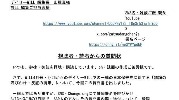 「保守論壇誌」を自認されている、「月刊WILL」さん、そのYoutube媒体「デイリーWILL」さんに、マスコミ・ジャーナリズムとしての矜持を問います