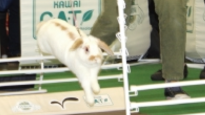 ラビットホッピングにおいても、共に楽しめるエキシビションとして、怖がり硬直したうさぎを何度もバーの前に戻し、お尻をつつきジャンプを強要する動作、飛び越える事ができない子は硬いバーにぶつかりながら、必死に走っていました。