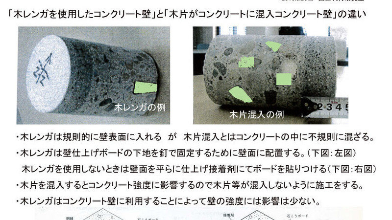 しかし、専門家によると、これは木片ではなく、木レンガで、コンクリート施工時に型枠に木レンガを計画的に配置して、型枠を取るとコンクリート壁面に木レンガが現れ、壁仕上げボードの下地を釘で木レンガに固定するという鉄筋コンクリート造の一般的な工法で、コンクリートコアの表面に木レンガがあるのはこのためとのことです。
