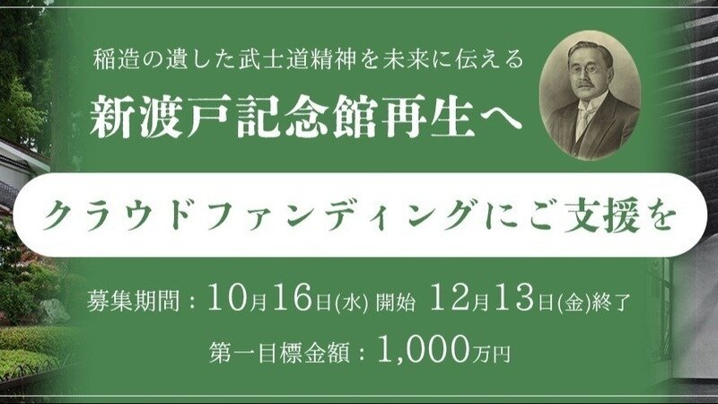 そして、新渡戸稲造の命日にあたる本日10月16日新体制での最初の事業として、新渡戸稲造の武士道精神を体現する「生田建築」の再生と更新の費用を募るクラウドファウンディング 新渡戸記念館再生へ/稲造の遺した武士道の精神、日本の心を未来へ[実施期間2024年10月16日(水)~12月13日(金)]をスタートしております。
