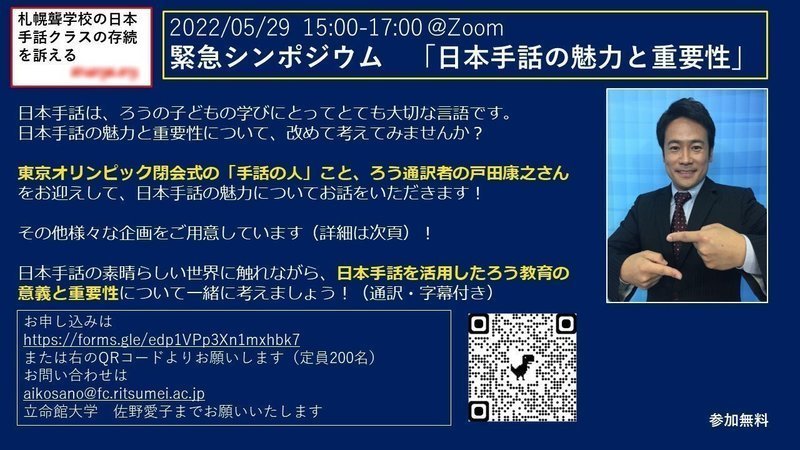 ろう通訳者の戸田康之先生のご講演、札聾保護者・教員のお話や日本手話による絵本読みの実演など、盛りだくさんなコンテンツで日本手話の魅力と重要性について考えるシンポジウムです。