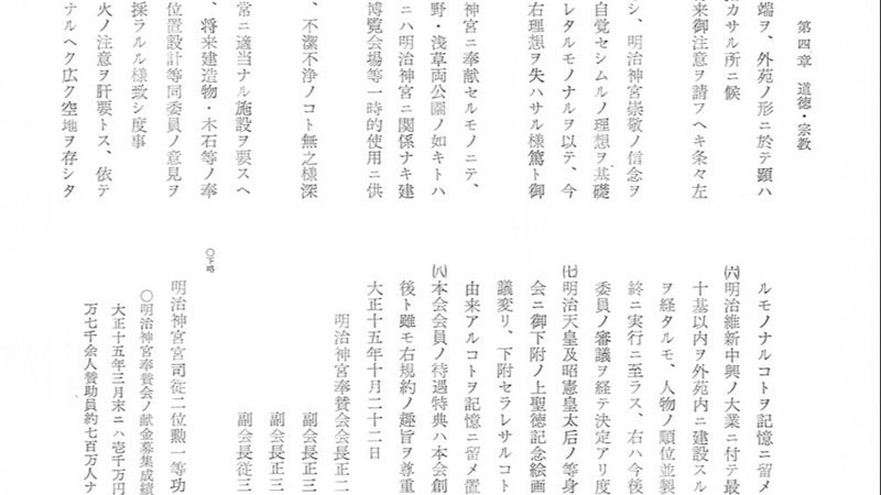 (二)外苑ハ国民多数報恩ノ誠意ニヨリ明治神宮ニ奉献セルモノニテ、他ノ遊覧ノミヲ主トスル場所例ヘハ上野・浅草両公園ノ如キトハ其性質ヲ異ニスルヲ以テ、今後外苑内ニハ明治神宮ニ関係ナキ建物ノ造営ヲ遠慮スヘキハ勿論、広場ヲ博覧会場等一時的使用ニ供スルカ如キ事モ無之様御注意アリ度事