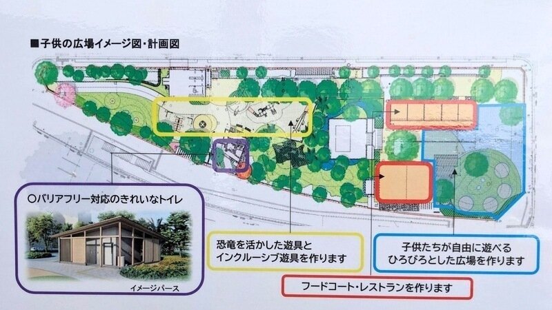 リニューアルのポイントの第一番目にも「広場機能を残して開放的な広場を整備します!」(←クリックで図を表示、看板の右側真ん中の赤字部分)と高らかに宣言されています。