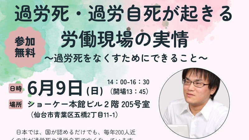 6月9日(日)14時から、仙台にて「過労死・過労自死が起きる労働現場の実情」が開催されます。主催は「宮城過労死を考える家族の会」です。
