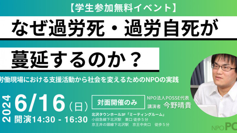 このイベントでは『ブラック企業』の著者であり、過労死問題の最前線で遺族支援や社会発信に取り組んでいる今野晴貴・POSSE代表を講師に、POSSEに寄せられた相談を元に実際の労働現場の実態や、過労死が発生した後の企業の対応、日本社会に蔓延する長時間労働やハラスメントをなくすために必要な取り組みなどについて考えます。