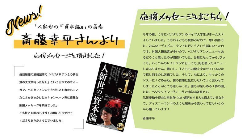 毎日新聞の連載記事で「ベジタリアンとの共生 食の大改革待ったなし」という日本でのヴィーガン、ベジタリアンの生きづらさを書かれていたことをきっかけに当キャンペーン宛に素敵な応援メッセージを頂きました。ご多忙にも関わらず快くお願い引き受けてくださりありがとうございました!