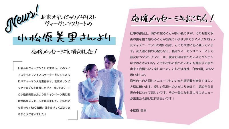 日頃からヴィーガンとして生活し、そのライフスタイルでアイススケーターとしてもさらにパフォーマンスを進化させ、北京オリンピックでメダルを獲得したヴィーガンアスリートの小松原美里さんより当キャンペーン宛に素敵な応援メッセージを頂きました。ご多忙にも関わらず快くお願い引き受けてくださりありがとうございました!