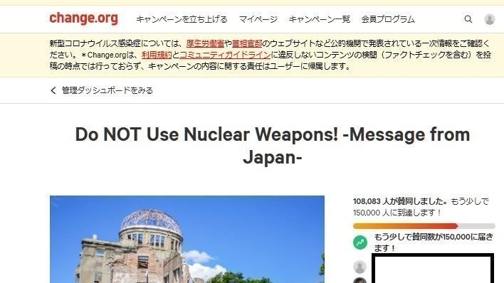 皆様の御賛同が10万を超えた時点で、プーチン大統領、岸田総理、そしてその他の核保有国の首脳に、このキャンペーンの趣旨を伝える書簡を送りました。