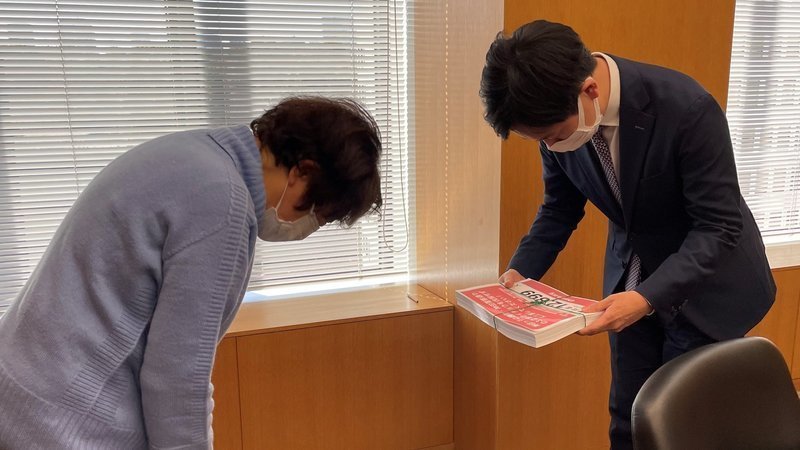 1月21日午前、千代田区役所にて、樋口高顕区長に、署名を提出しました。